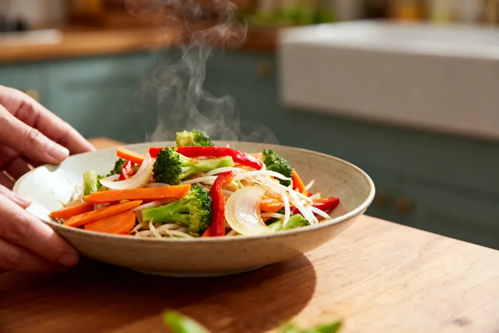 Serveer het direct zodat de knapperigheid blijft. De geur van verse groenten en lichte saus maakt het meteen aantrekkelijk.